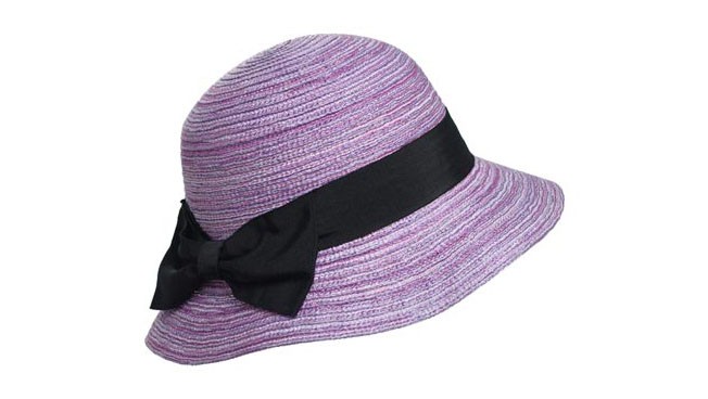 優(yōu)質(zhì)的天然草帽,用深淺不一的紫色一圈圈的編織,黑色的蝴蝶結(jié)頗具時(shí)尚和活力。
