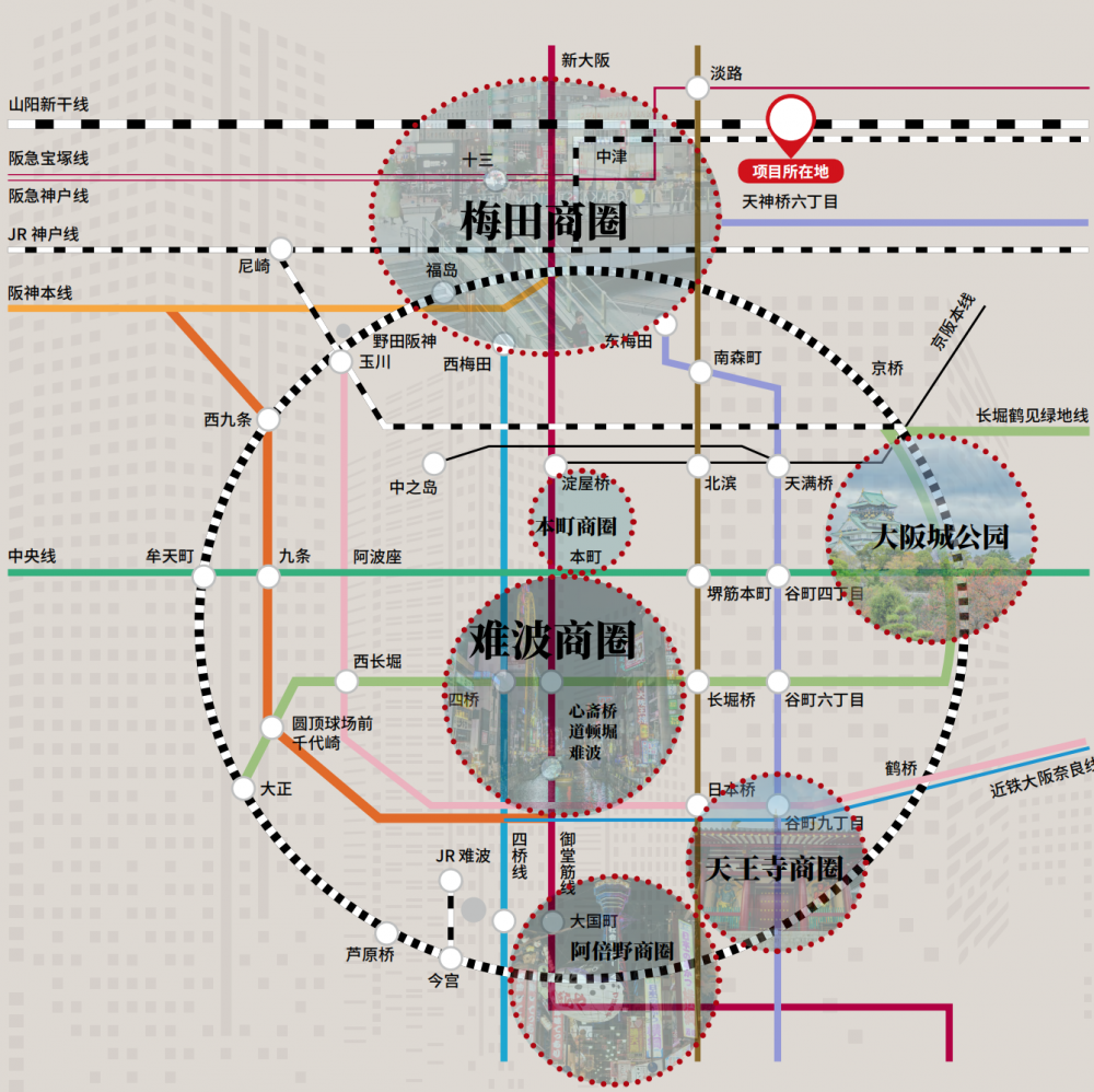 項(xiàng)目地段:梅田,大阪的璀璨明珠,經(jīng)濟(jì)的心臟地帶。大阪站,交通的神經(jīng)中樞,JR線、阪急線、阪神線和三條地鐵線在此交匯,編織出一幅繁忙而有序的都市畫卷。